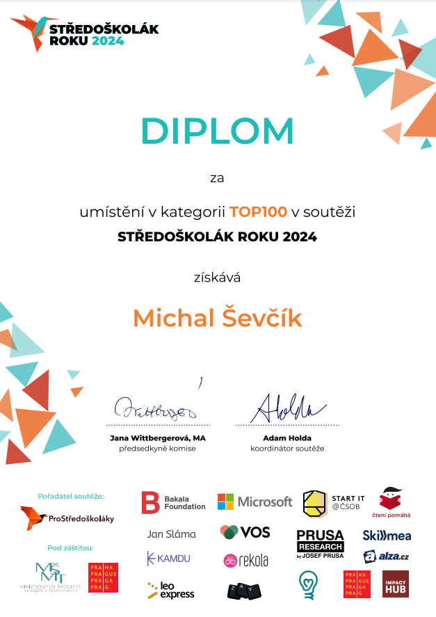 Středoškolák roku Publikováno 12. 9. 2024 · Změněno 12. 9. 2024 Náš žák Michal Ševčík obdržel ocenění „Středoškolák roku“. Gratulujeme.