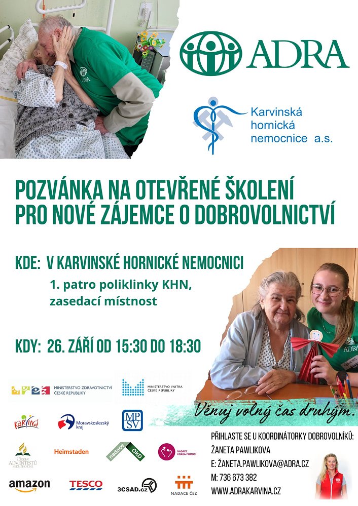 ADRA a KHN Publikováno 19. 9. 2024 · Změněno 19. 9. 2024 Pozvánka na otevřené školení pro nové zájemce o dobrovolnictví