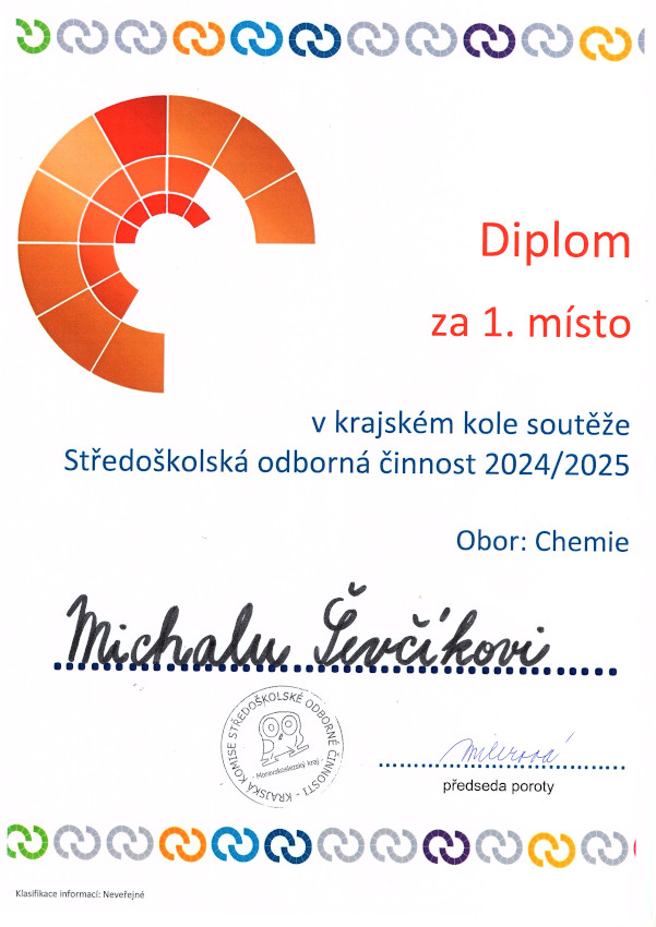 V pátek 9. května 2025 se konalo krajské kolo Soutěže odborných činností (SOČ), kterého se zúčastnil i náš žák Michal Ševčík. Ve své kategorii dosáhl vynikajícího výsledku a obsadil 1. místo.