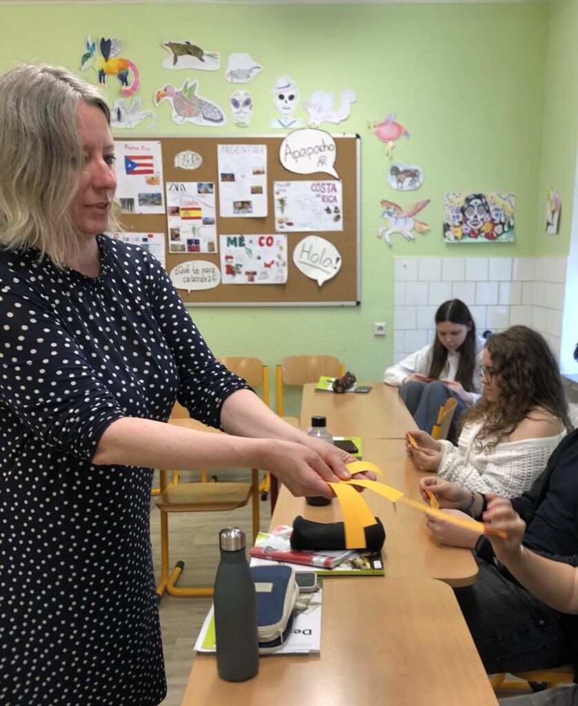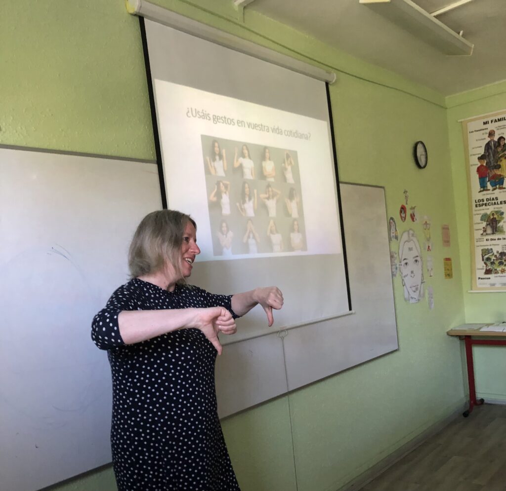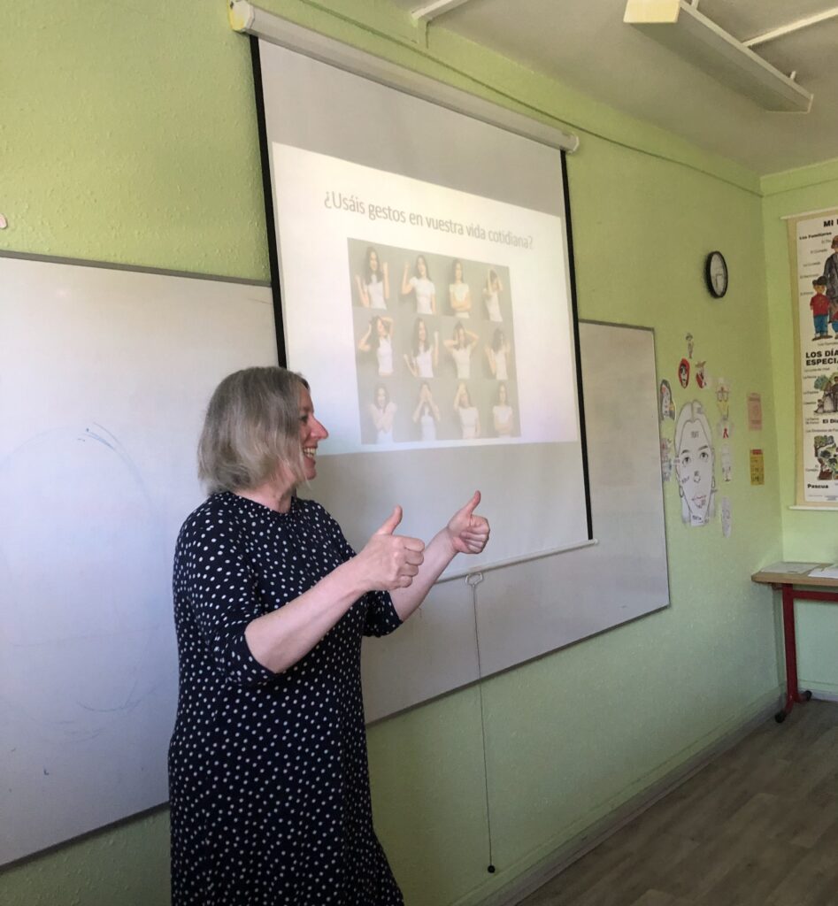 Pozvání přijala Mgr. Irena Fialová, Ph.D., zástupkyně vedoucího katedry romanistiky, pedagogická poradkyně a koordinátorka výuky lektorských jazyků, která si pro naše studenty připravila workshop na míru zaměřený na neverbální komunikaci, konkrétně na gesta typická pro španělsky mluvící země.