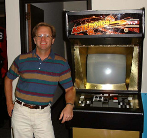 Hra Asteroidy byla vytvořena v USA roku 1979. Lyle Rains (dole vlevo) hru vymyslel a Ed Logg (dole vpravo) naprogramoval. Dále se menšími úkoly na hře podíleli i jiní zaměstnanci firmy Atari, pro kterou Logg i Rains pracovali. Hra se inspirovala monha jinými, zejména vesmírnými hrami, mimo jiné Space Invaders. Patří mezi první arkádové hry, které využívají tehdy novou technologii vektorové grafiky, díky které se mohl vytvořit efekt trojrozměrného prostoru. Hra se stala velmi populární a ovlivnila mnoho dalších her. Tuto hru si můžete zahrát například zde.